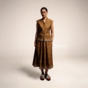 Menggunakan bahan katun yang nyaman, setiap detailnya diperkaya dengan motif batik “Kembali” yang menjadi simbol perjalanan tumbuh dari benih hingga mekar. Dalam balutan Langgam Kartini, motif ini membawa pesan tentang keberanian perempuan untuk terus berkembang, tanpa kehilangan kelembutannya.